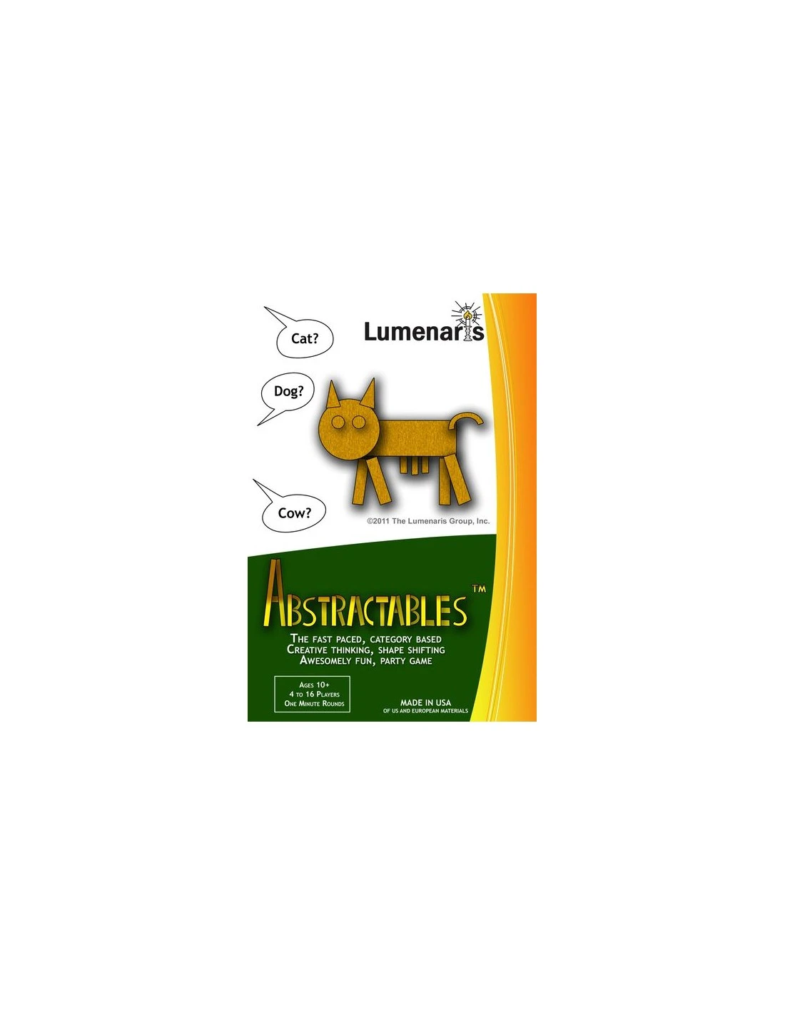 Abstractables contains 3-layer European Birch hardwood pieces, category cards with over 2000 words or phrases, a one-minute timer, and an 8-sided category die.