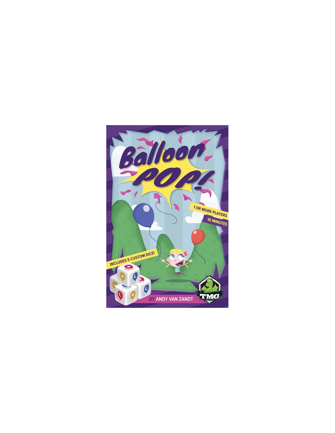 In Balloon Pop!, each player has a scoresheet with six columns on it. On a turn, you roll three dice, with each die face showing a balloon color and a shape, then record the results by circling numbers from the bottom of the column, going up. The highest number you circle in a column equals the points that you score.