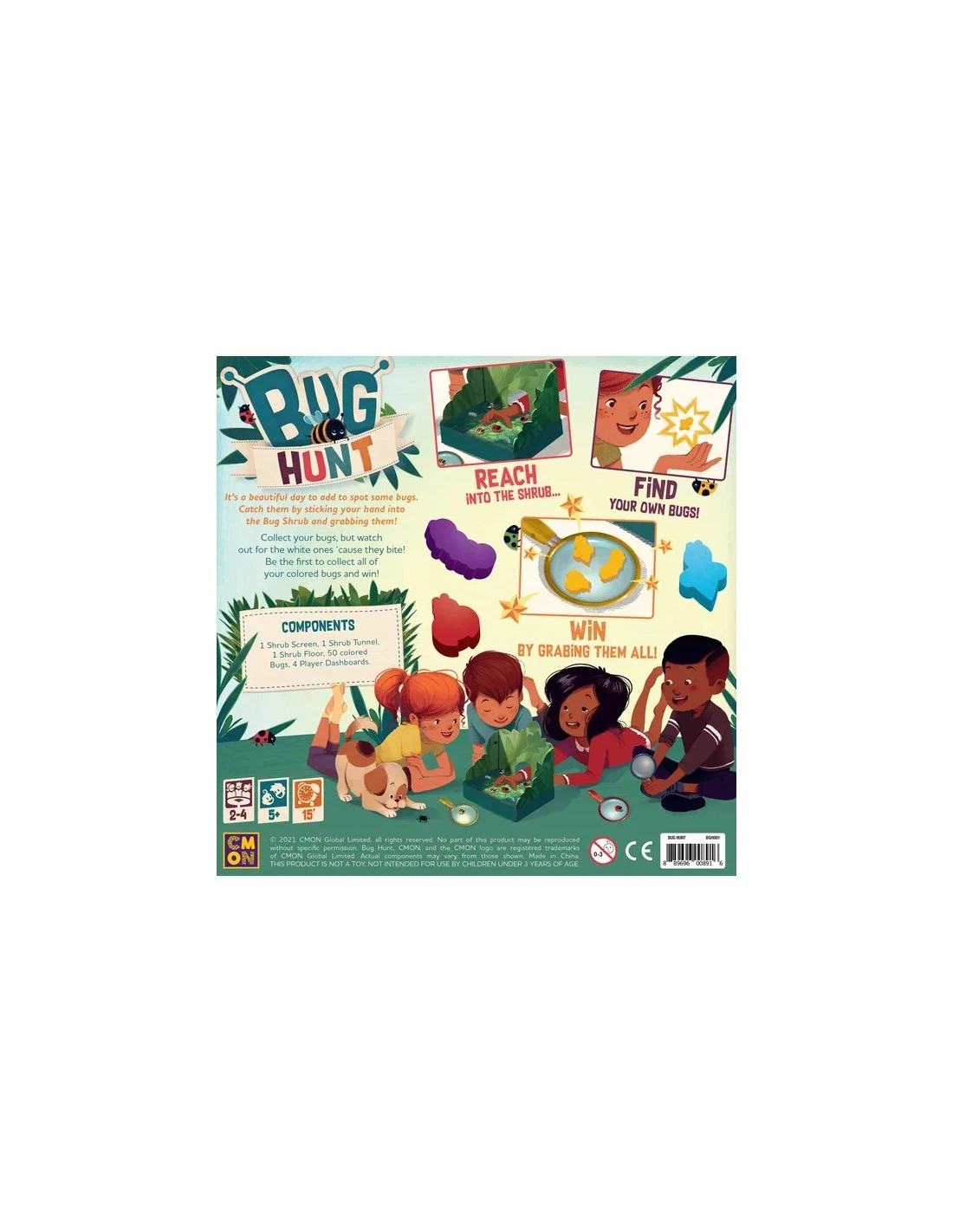 At the start of the game, they construct the bug shrub and fill it with all manner of bugs. Then, they reach in through the shrub’s tunnel opening to try to grab theirs — but they have to watch out for the other players’ bugs as well as the white ones, who are known to bite any hand that tries to grab them. The first player to finish their collection wins.