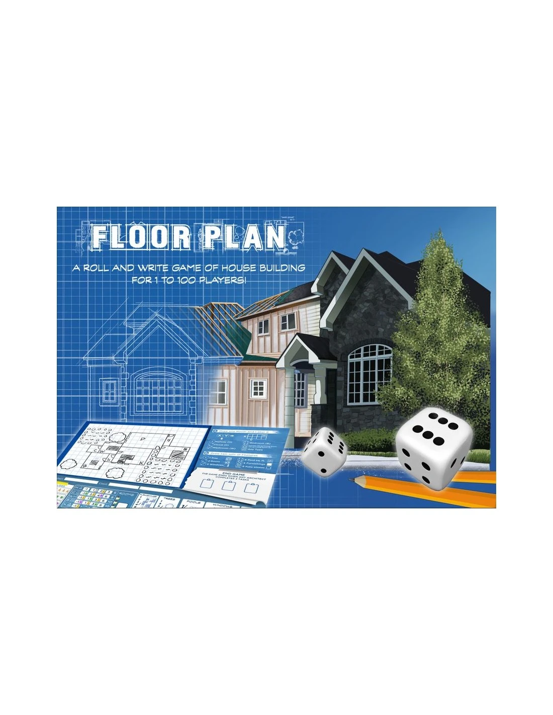 In Floor Plan players take on the role of an Architect designing a house for a client. Each round, a pair of dice are rolled and then players will act simultaneously, using the dice to either draw a new room onto their floor plan or add crucial architectural and landscaping features.