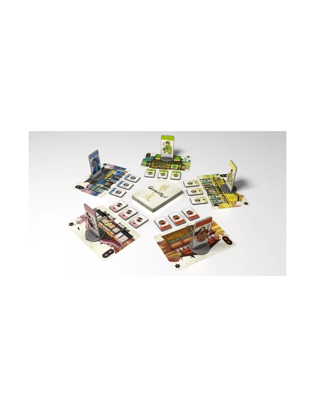 To do so, players help their favored geisha advance and build prestige through performing their art at different teahouses. Geisha start as apprentices (maiko) but become full geisha and score prestige points after accruing the necessary patronage to return to their original teahouse (ochaya) for the graduation ceremony (erikae). Some geisha may continue their path further and eventually inherit the teahouse (upon a second return) to become the new okaasan, recognized with more prestige points.
