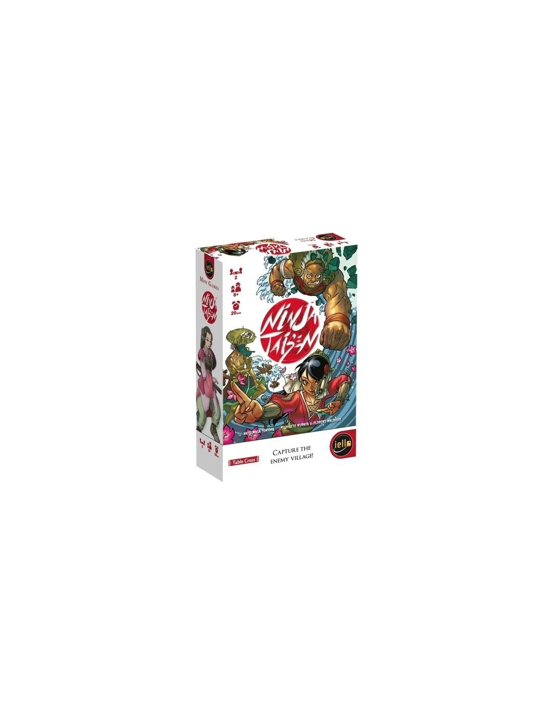 Ninja Taisen is a two-player, dice-driven open information abstract game with a random set-up. Both players have identical sets of ten fighters, with three fighters in each of three colors with values 1–3 along with a tri-colored boss valued at 4; these fighters are placed in small stacks of varying size onto a line that’s eleven steps long. On a player’s turn, he rolls the three colored dice and can make up to three moves accordingly, with the blue die moving a blue fighter, etc. Moving a fighter that has other fighters on top of him moves these other fighters as well.