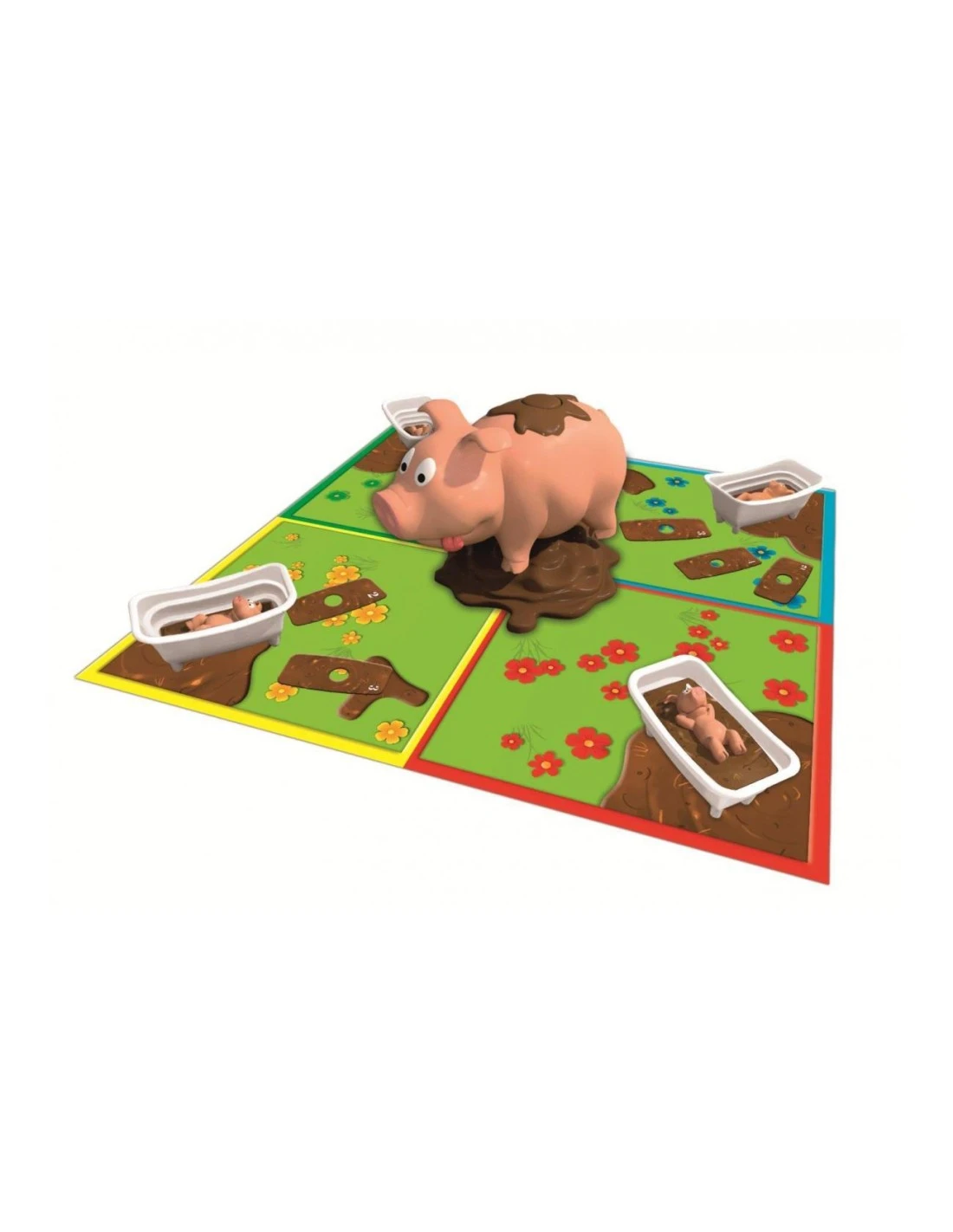 Each player gets a piglet and a bath. On his move he turns the big pig (spinner), depending on the sound the pig makes the player takes an action: