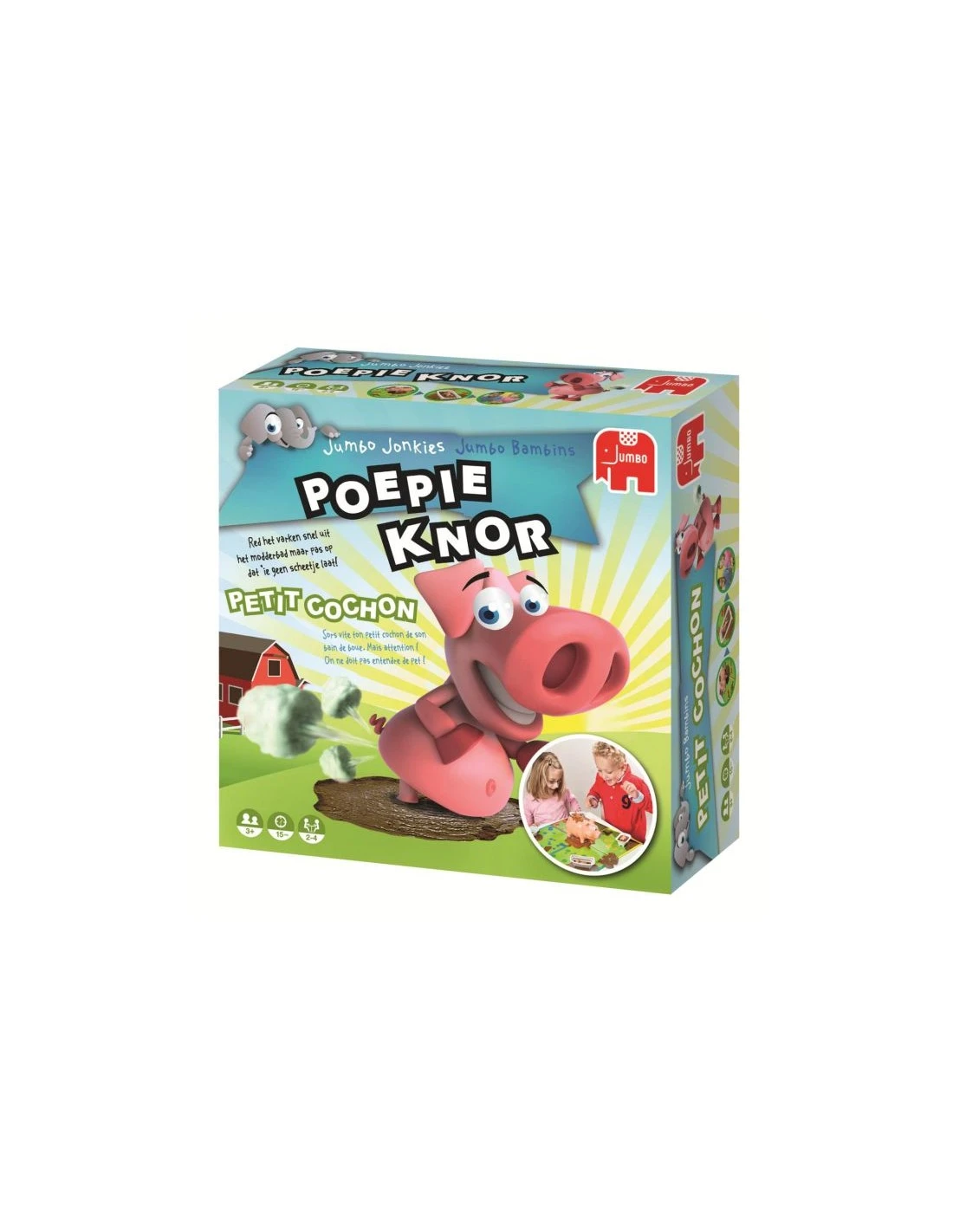 Poepie Knor is a game in which 2-4 player try to rescue their piglets from his dirt bath. But if you hear a fart your piglets sinks deeper in the mud.