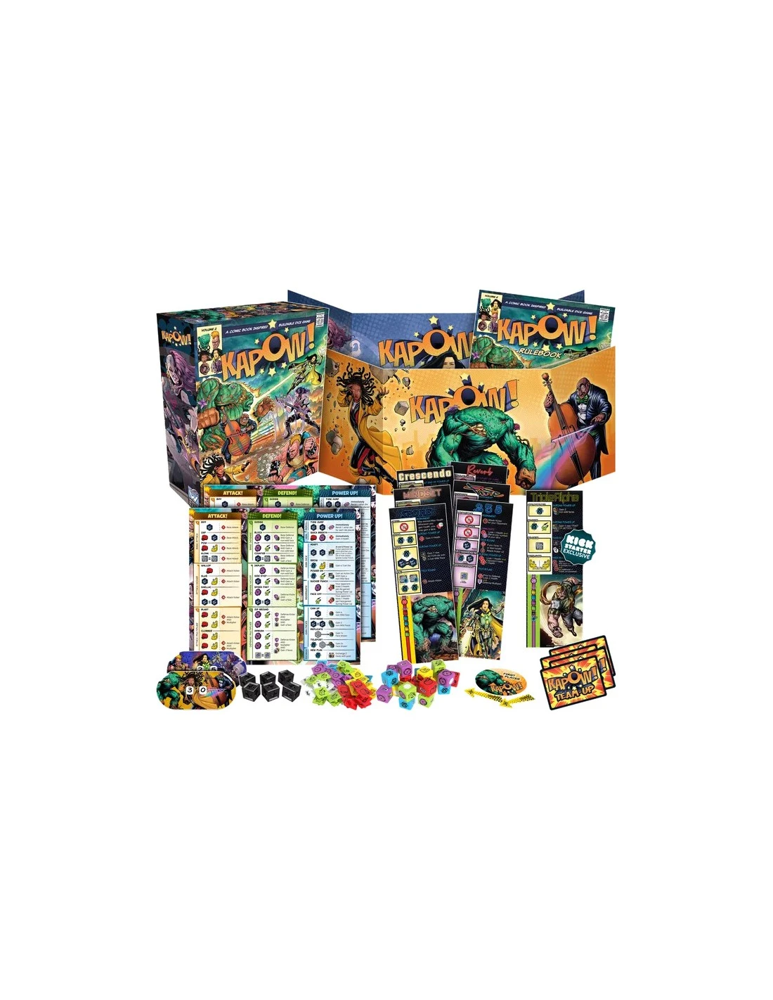 KAPOW! Volume 2 contains six supers: Mindset, Spore, and Crescendo are the heroes, while Fuse, 235, and Reverb are the villains. This set can be combined with KAPOW! Volume 1 to mix and match the characters or have up to four players in one game.