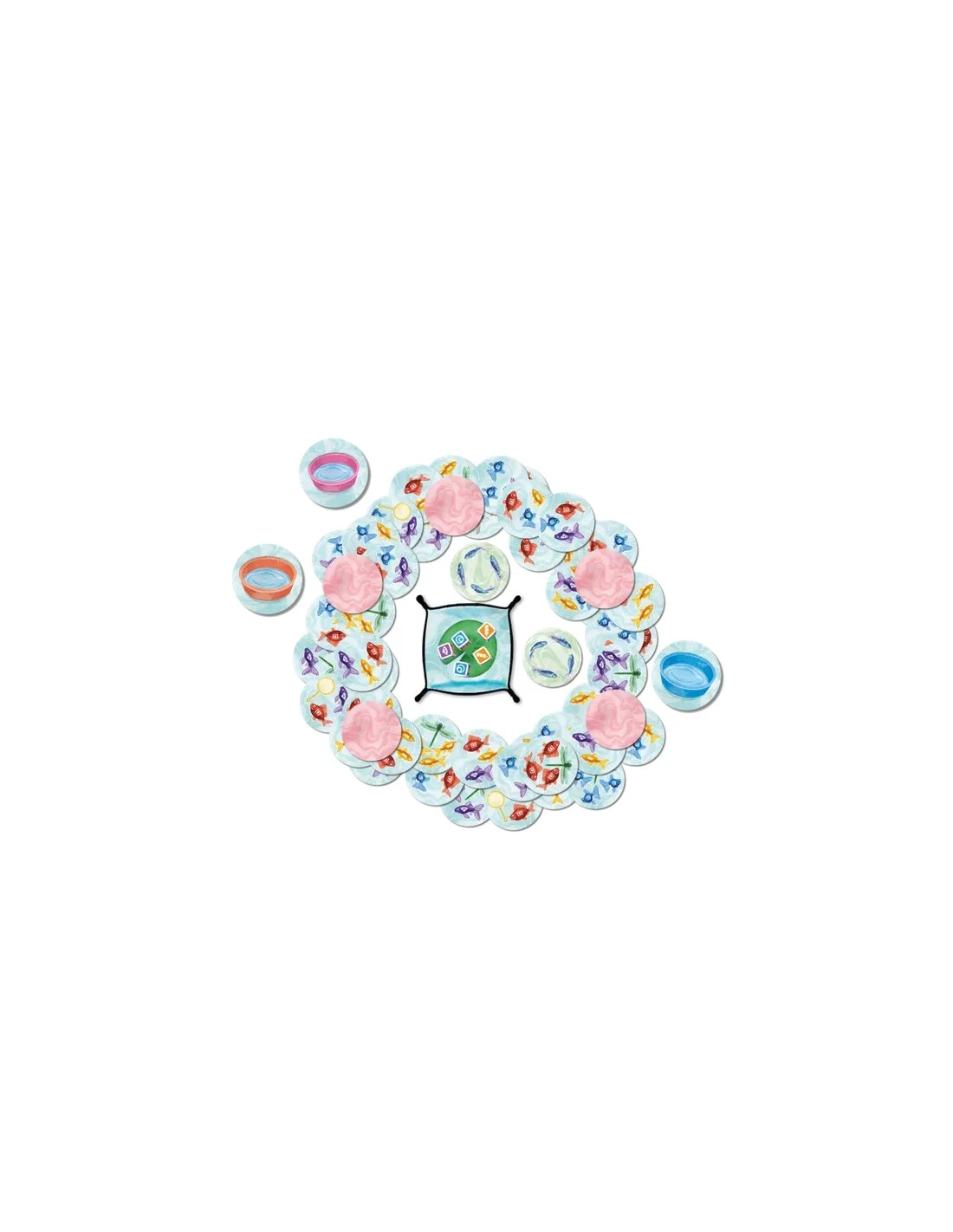 The Kingyo cards are laid out around the 5 dice. Players can divide themselves into teams as they wish. Each player takes a Bowl card to place the Kingyo cards they will catch.