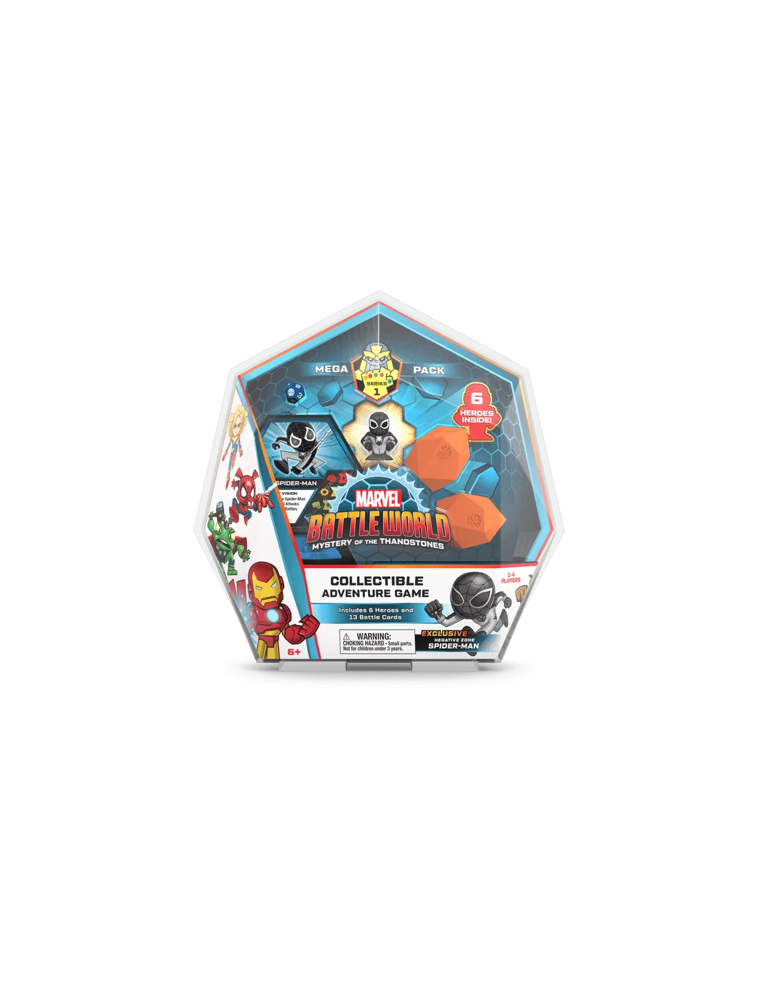 Pick your favorite Hero, rescue your friends, and win battles to defeat Thanos! Battleworld is a revolutionary cooperative, expandable, collectible adventure game featuring dozens of characters from all over the Marvel Universe! Players get to crack open the mysterious Thanostones during the course of play to reveal the mystery character inside for a constant sense of surprise and delight! Mega Packs let you jumpstart your collection with six characters: four starting Heroes (including an exclusive Negative Zone Spider-Man variant) and two more trapped in Thanostones! Choose your favorite hero, and use their unique special abilities. Roll to attack and win three battles to achieve victory!