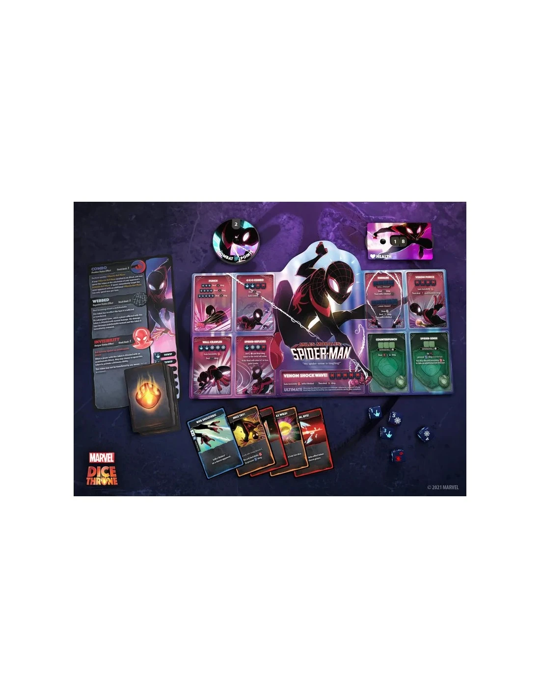 In Marvel Dice Throne , you become one of eight of Marvel’s most famous heroes, including Black Panther, Captain Marvel, Black Widow, Scarlet Witch, Loki, Thor, Doctor Strange, and Miles Morales Spider-man! Every Marvel Dice Throne hero was painstakingly designed and balanced to provide the most thematic experience possible, allowing you to truly embody your favorite heroes like no other game. Featuring all-new mechanisms and asymmetrical designs, these are our most innovative and exciting heroes yet.