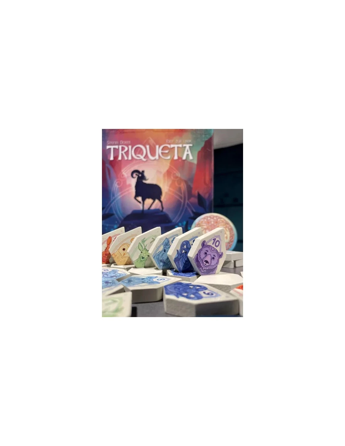 Triqueta is a set collection game for 2-5 players. Over four rounds, players draft animal tokens, trying to form a set of three for each animal type. Three tokens of the same type form a “triqueta”.