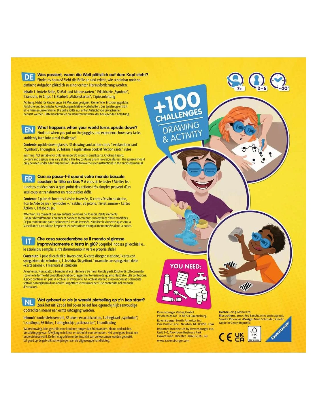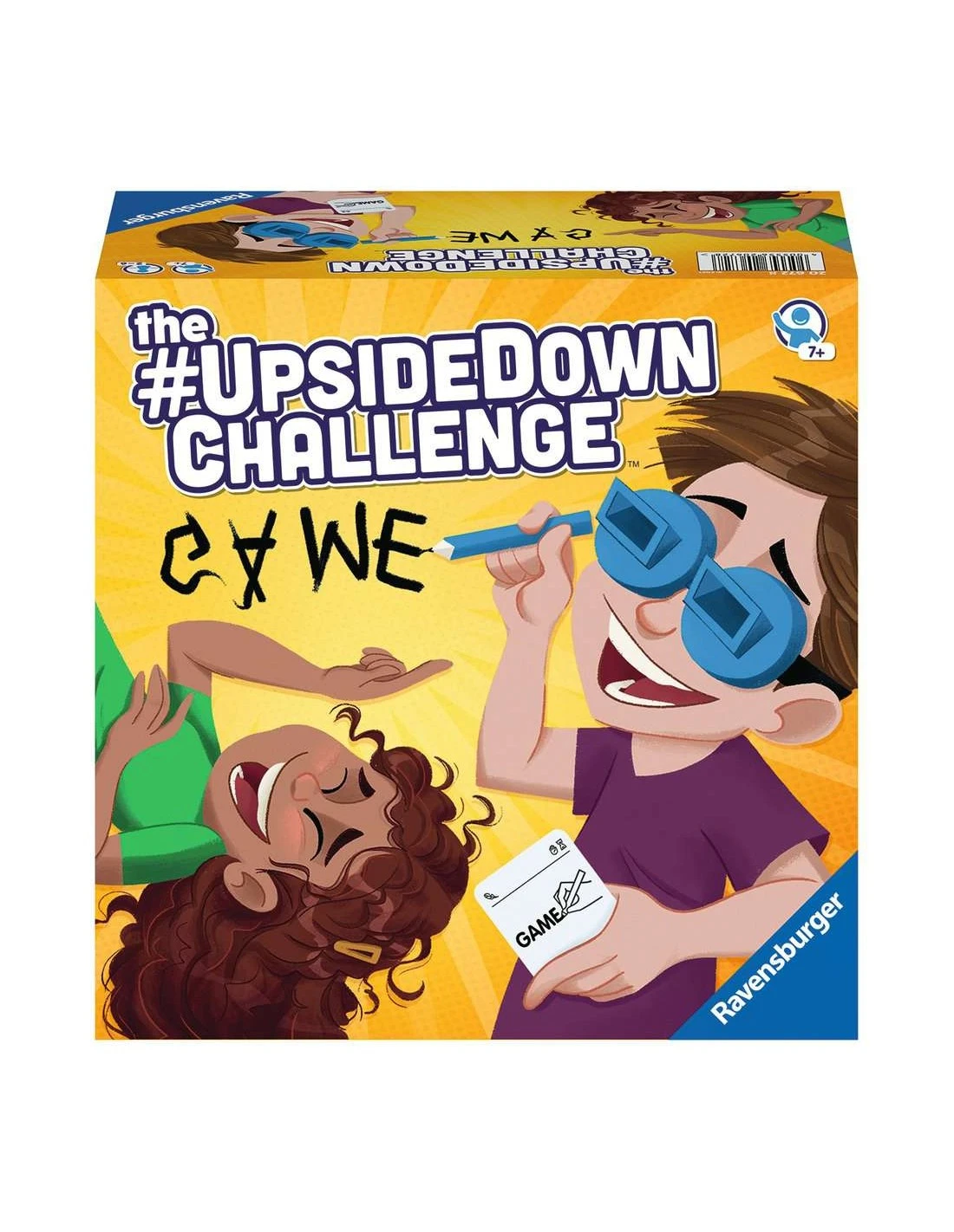 Each turn in The #UpsideDownChallenge Game, the active player draws a challenge card, which might be an individual challenge or a group challenge. Whoever the active player is dons glasses that flip their vision upside down, then they try to do what they’ve been challenged to do, such as giving someone a high five, pouring water into a glass, or drawing a picture.