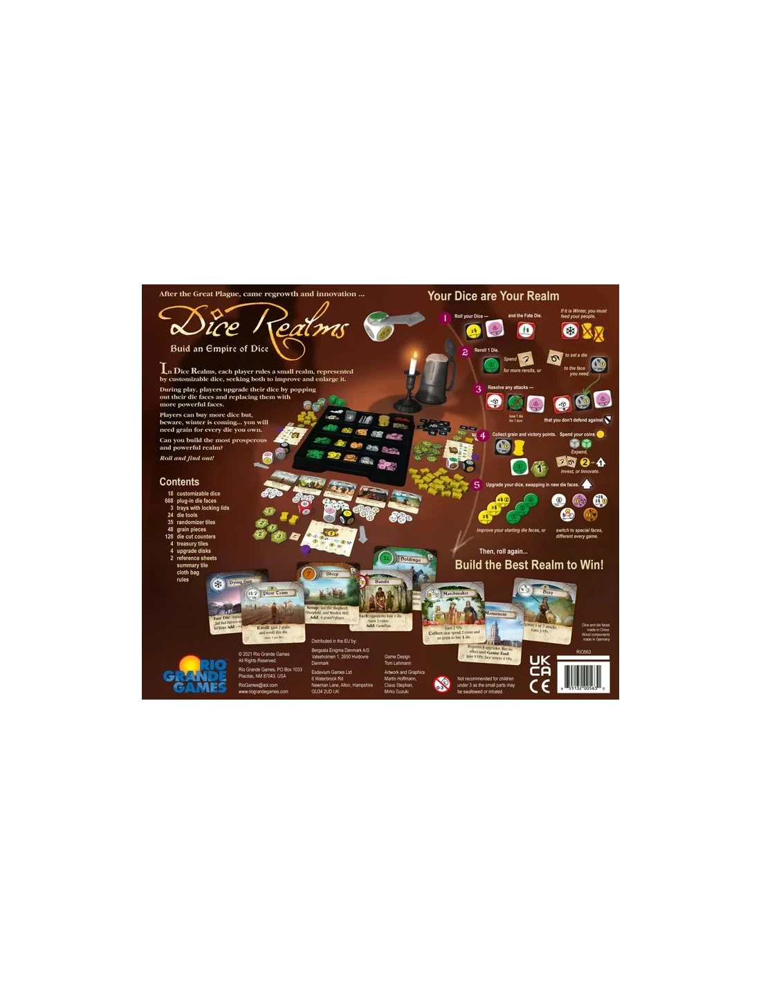 In Dice Realms, players vie to improve and expand their Medieval realms, while contending with Fate. Realms are represented by customizable dice with faces that can be popped out and upgraded for better ones.