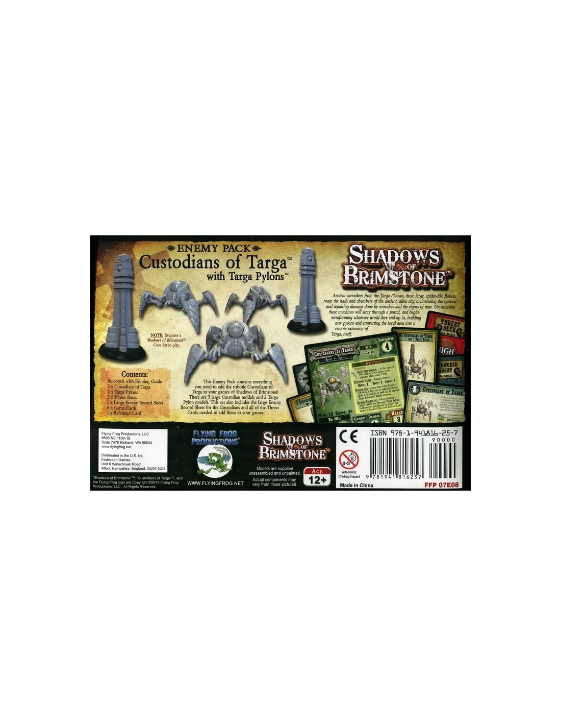 This Enemy Pack contains everything you need to add the robotic Custodians of Targa to your games of Shadows of Brimstone! There are 3 large Custodian models and 2 Targa Pylon models. This set also includes the large Enemy Record Sheet for the Custodians and all of the Threat Cards needed to add them to your games.